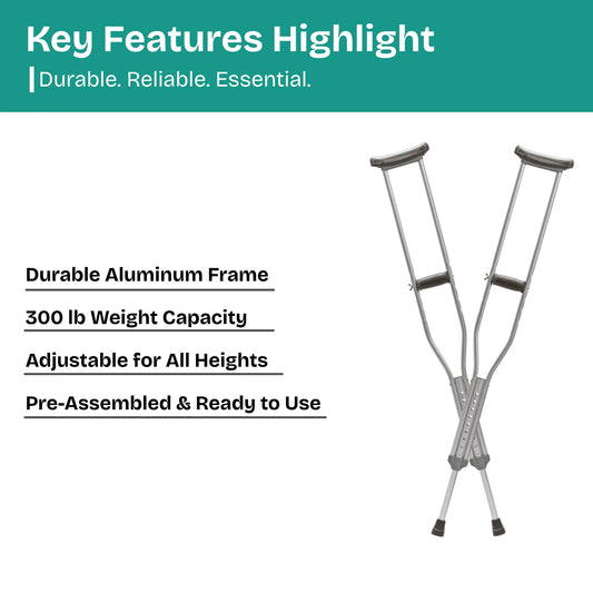 Aluminum Underarm Crutches, Lightweight & Adjustable